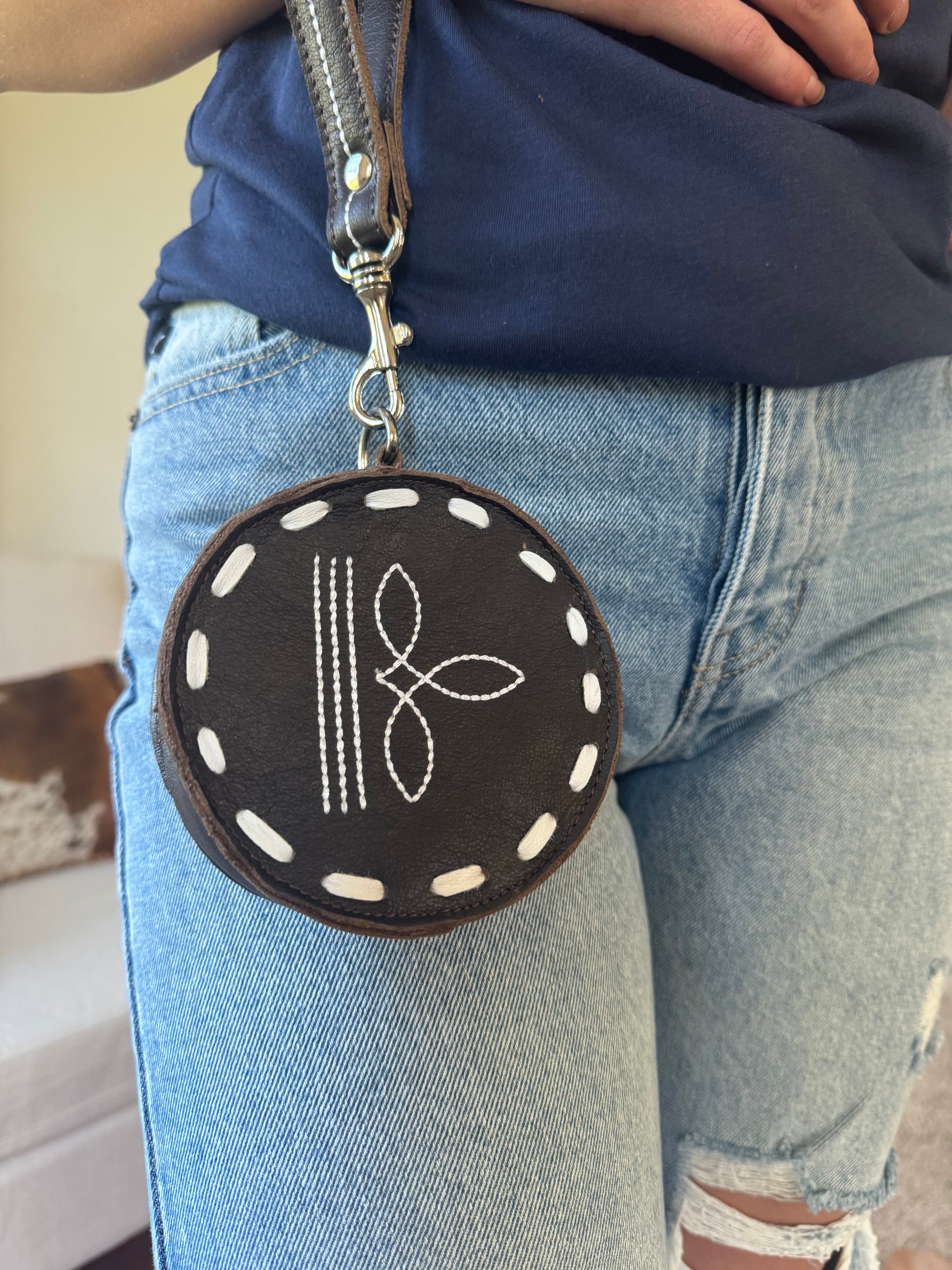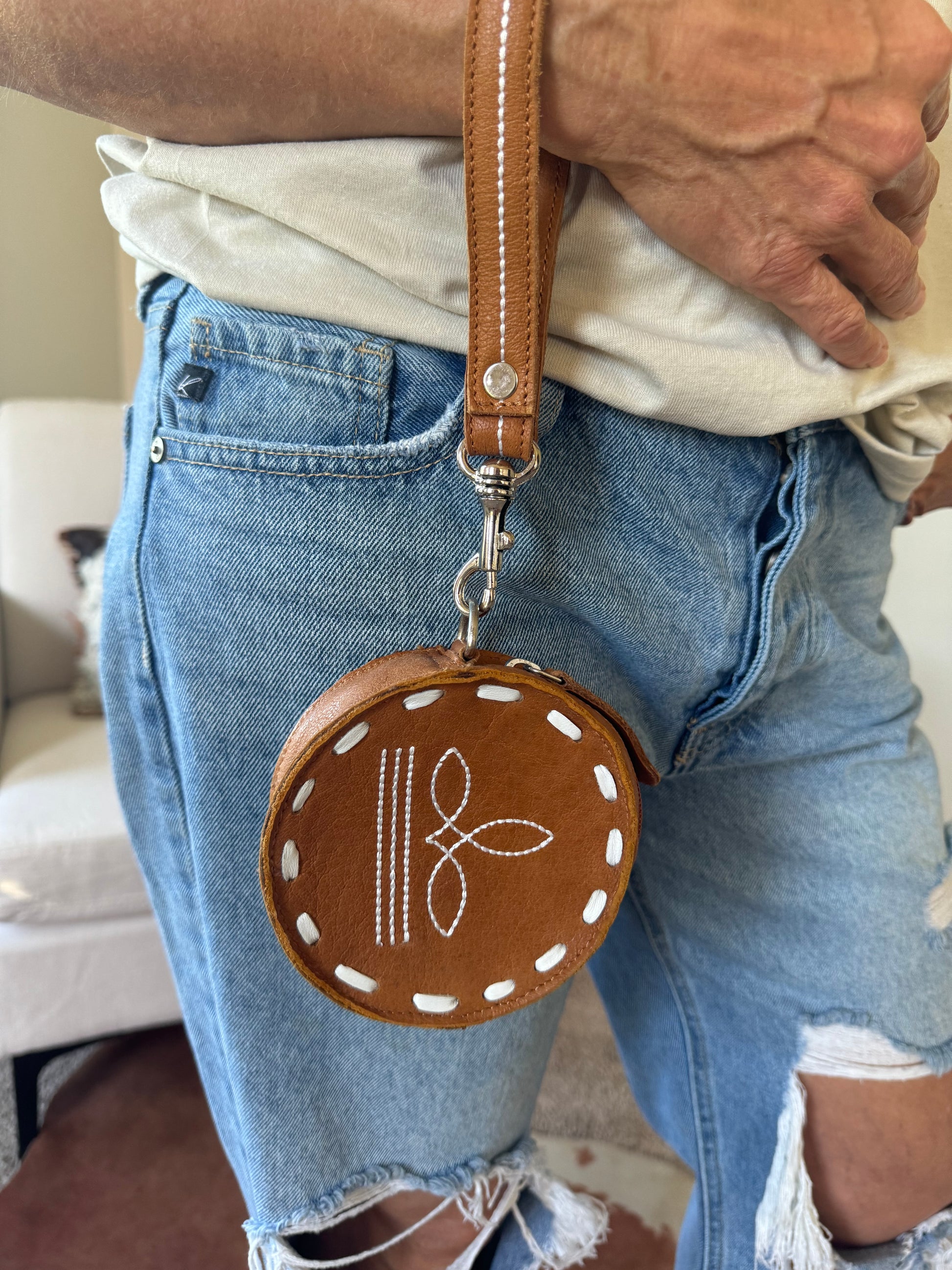 Genuine leather round pouch with a zipper and boot stitching detail - perfect for storing credit cards, cash and coins
