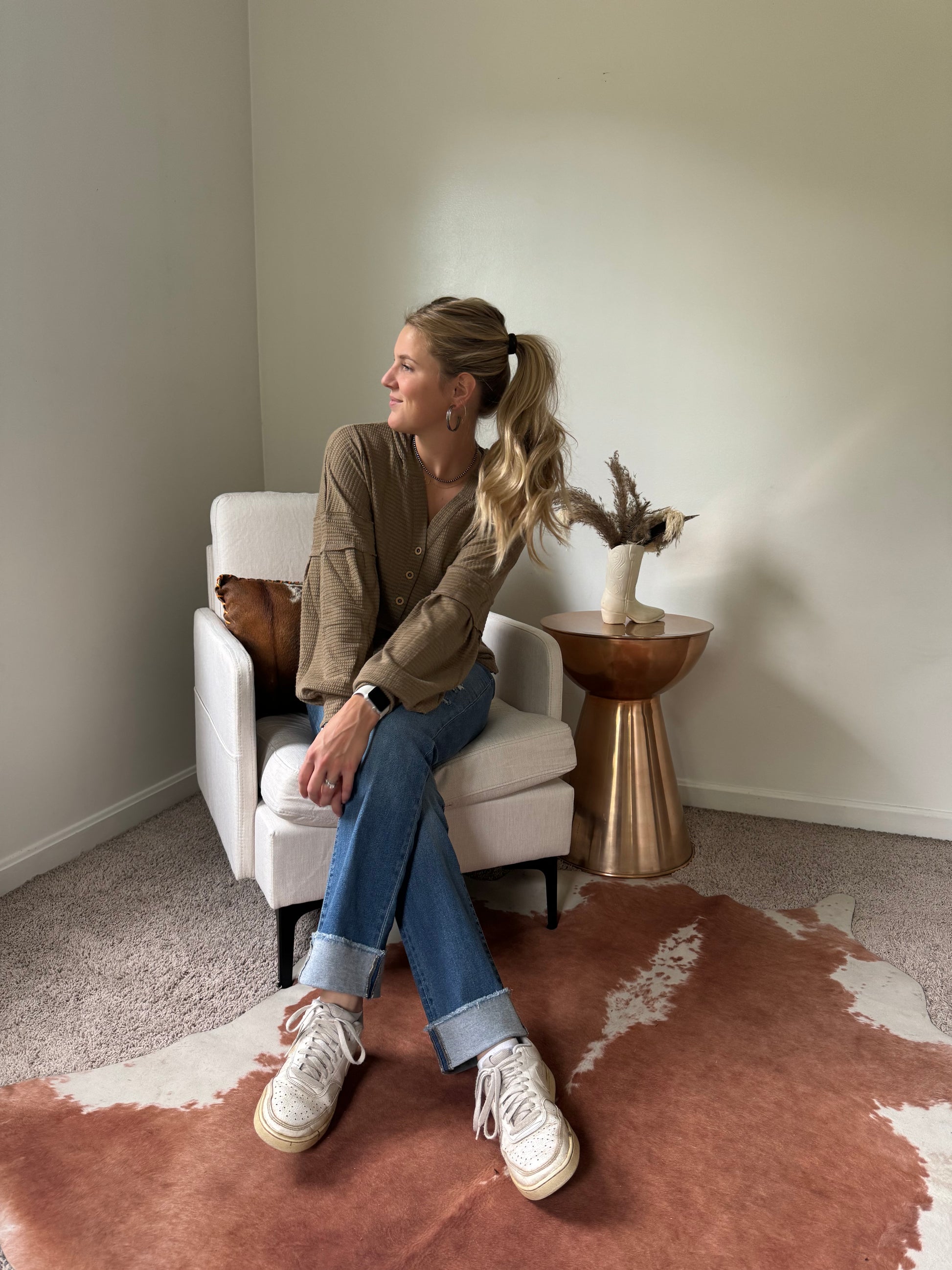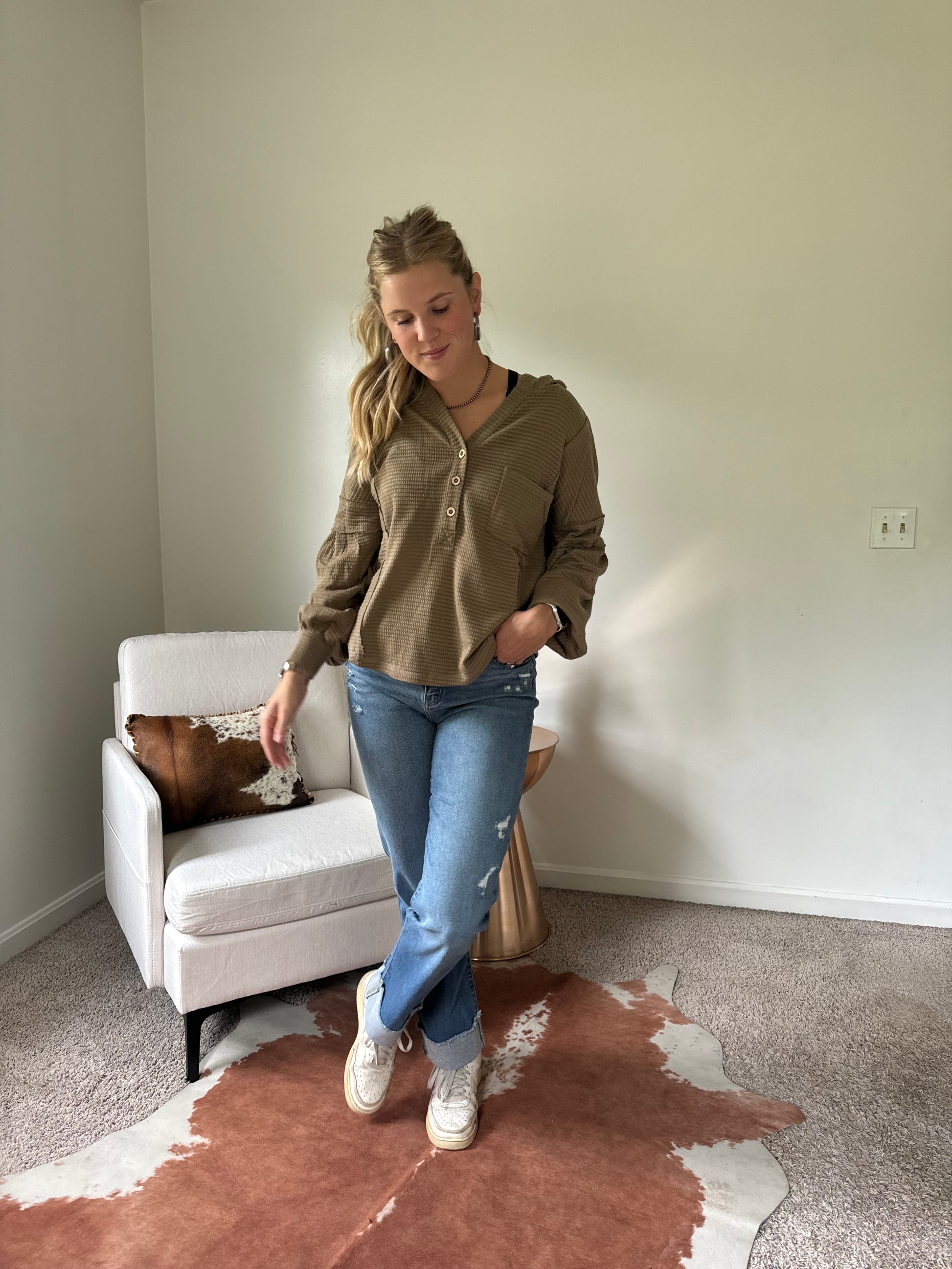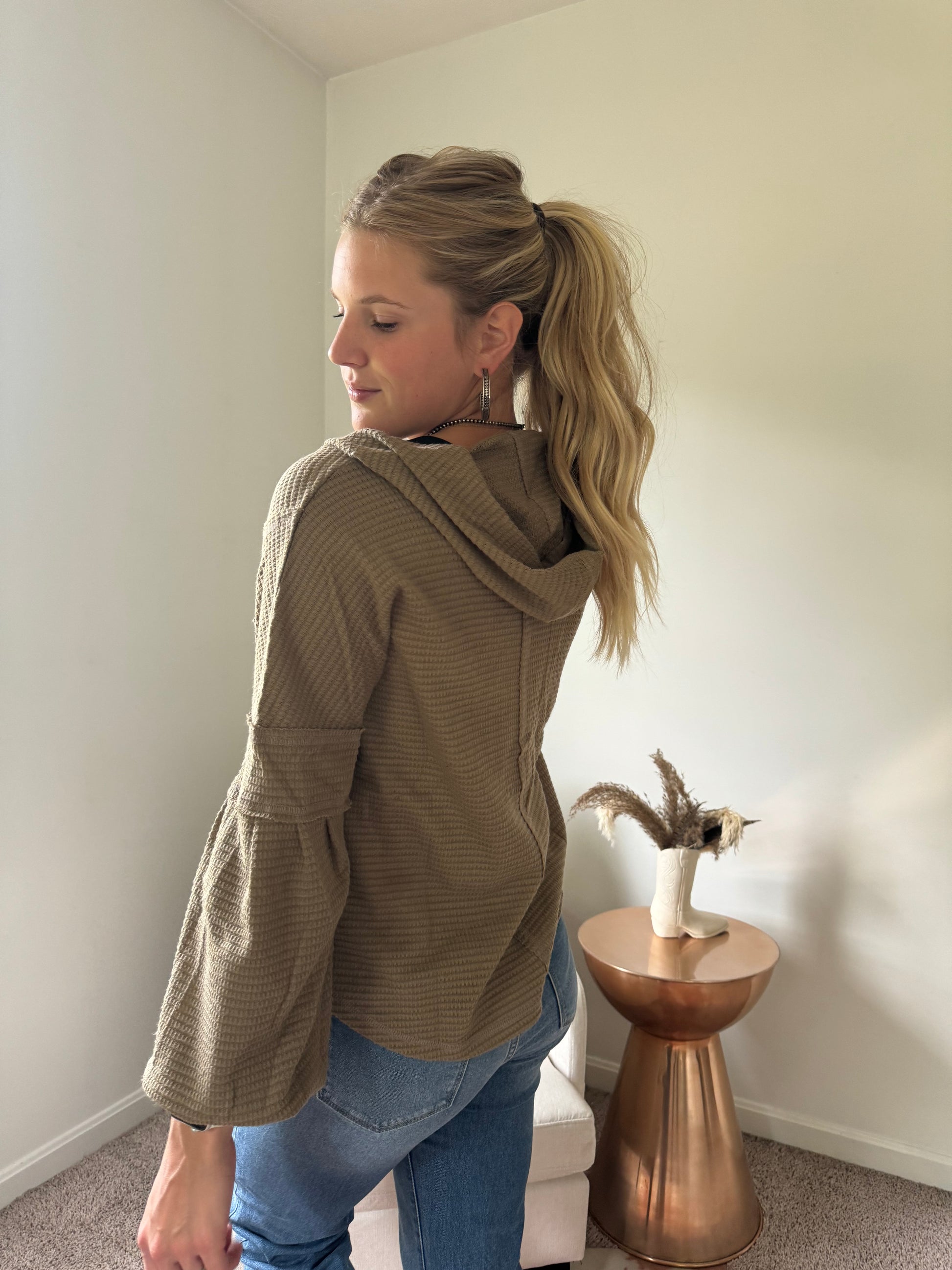 A nice top that is very versatile and will go with many outfits - one you can grab out of the closet to wear just about anywhere! It features a hood and is a waffle knit type material