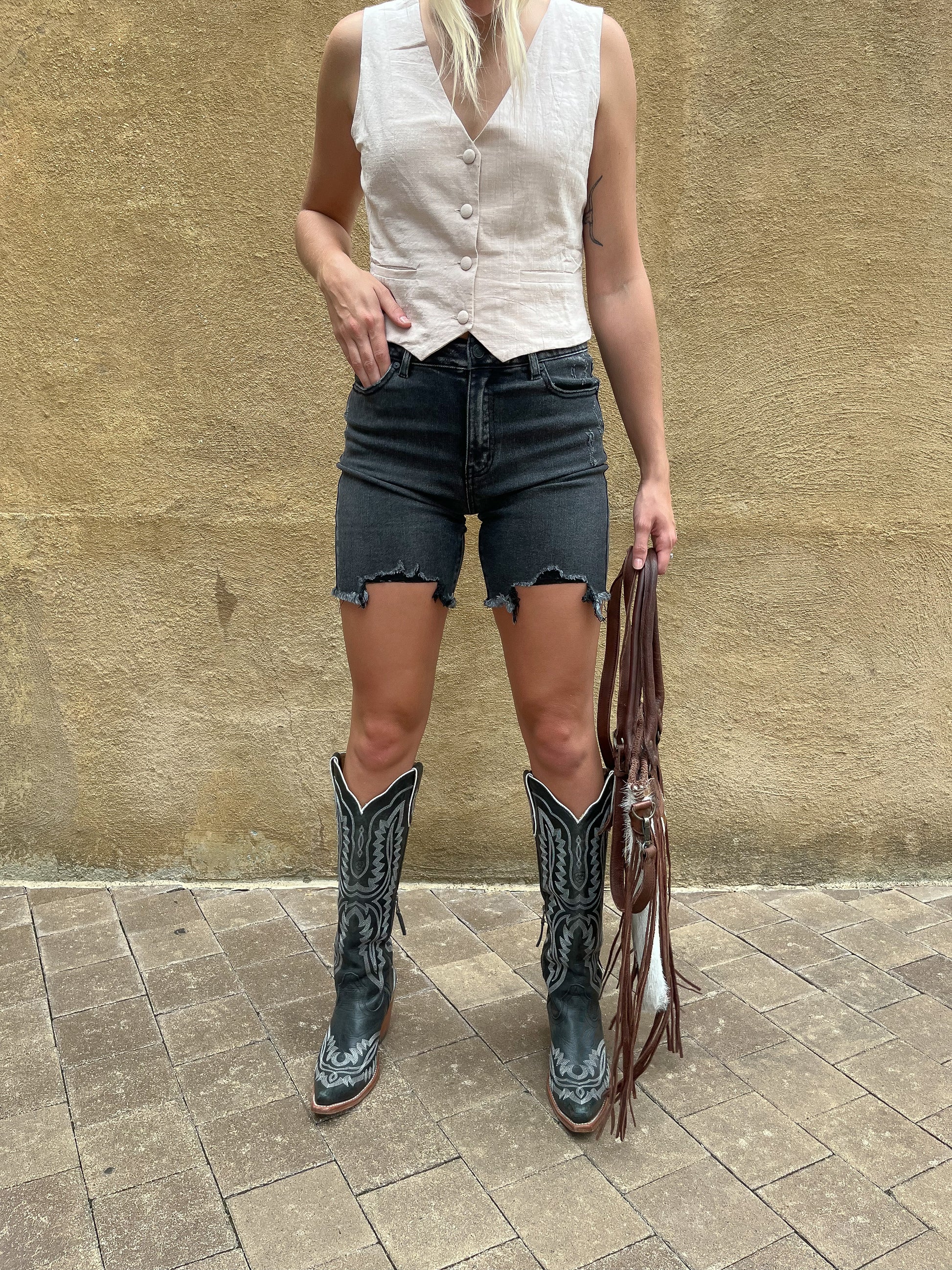 High-waisted black distressed denim bermuda shorts - 7" inseam - stretchy material for comfort