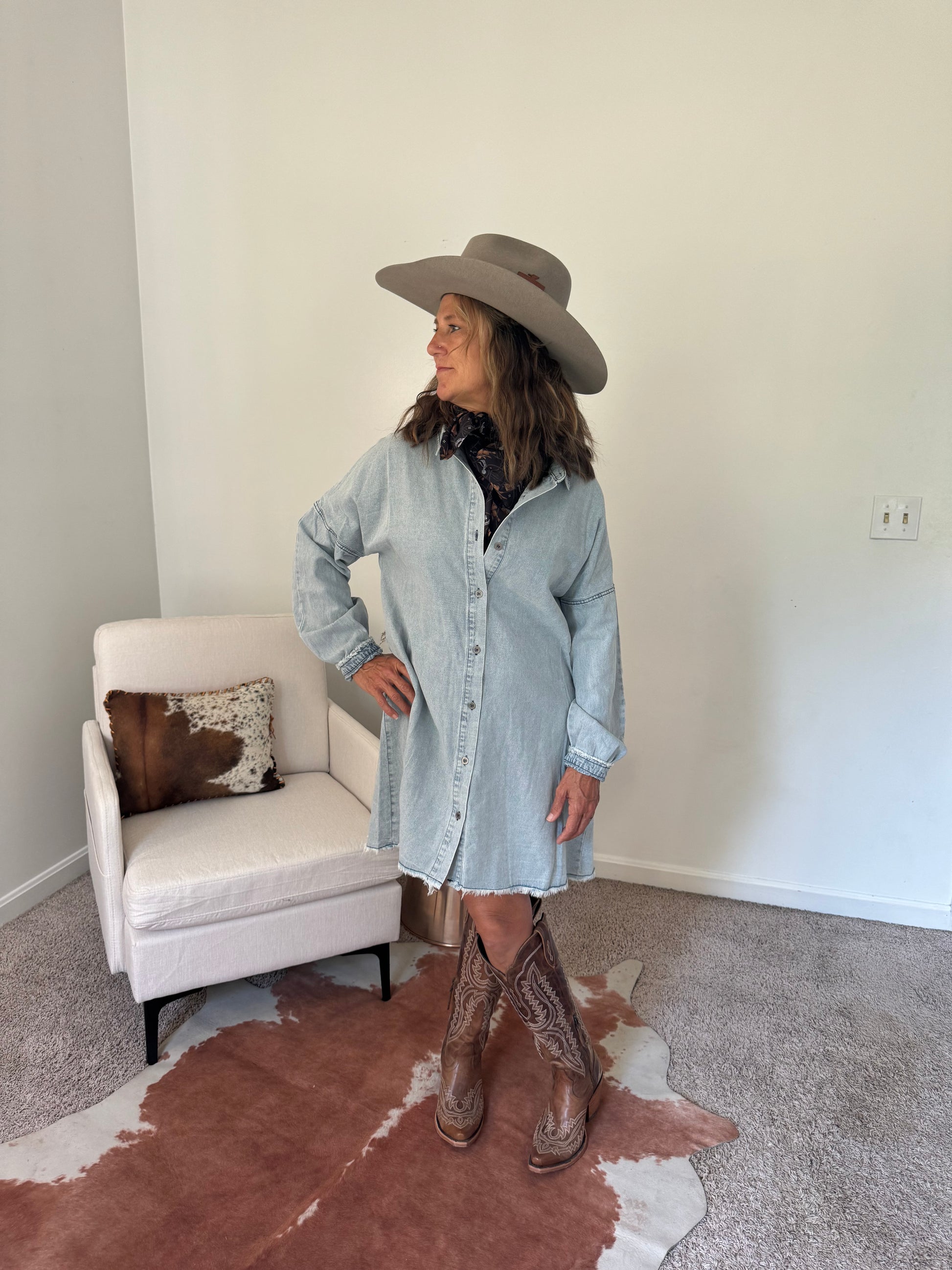 This denim piece is a beautiful light wash color - can be styled as a dress or wear it unbuttoned and opened as a duster. 80% COTTON