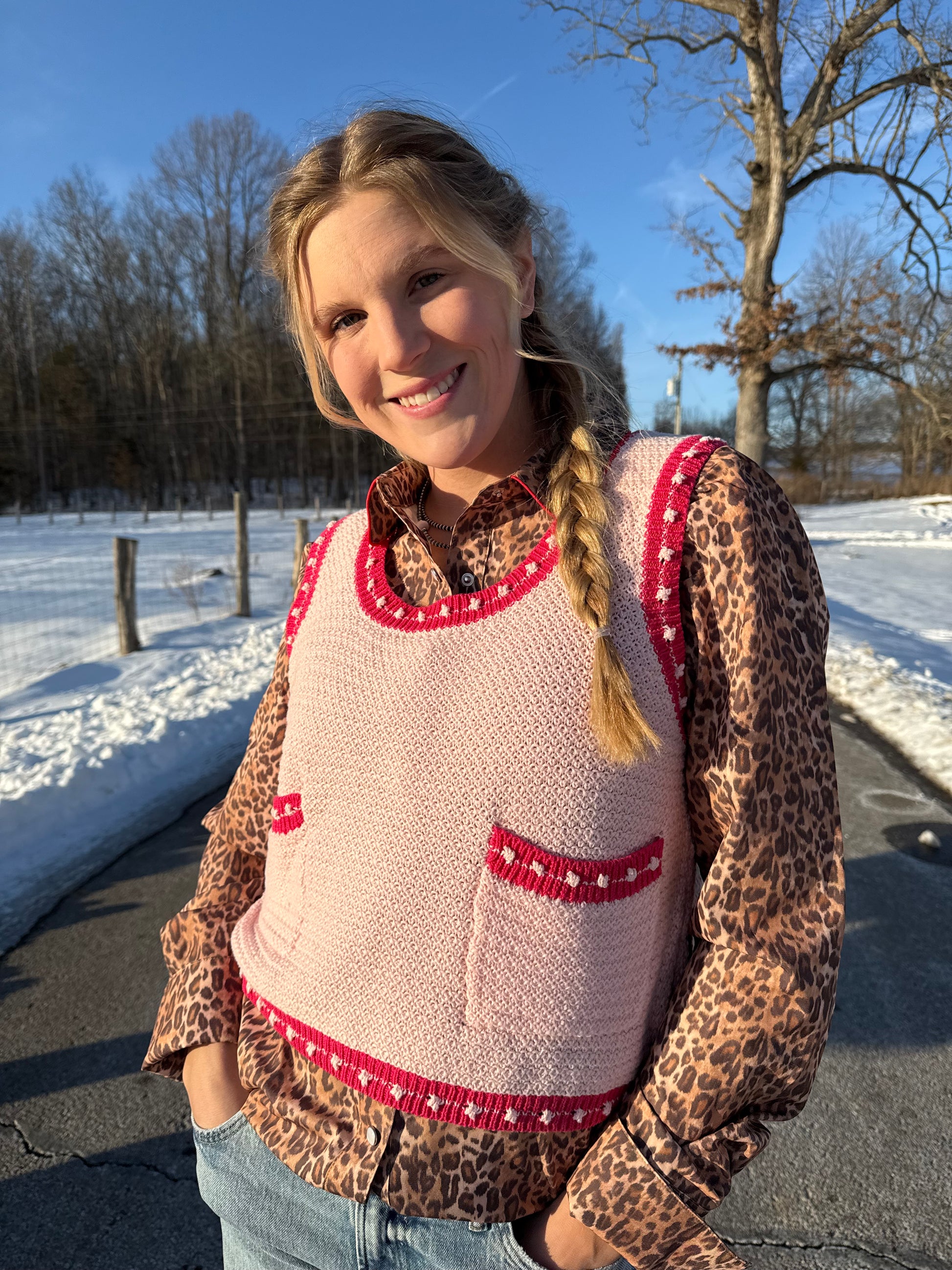 Pink knit vest with hot pink trim around collar, hem and pockets really making it POP! The most adorable vest to layer on top of your favorite pearl snap or button up or even a mesh lace top or long sleeve!
